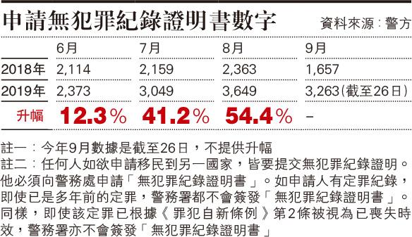 任何人如欲申請移民,皆要提交俗稱「良民證」的無犯罪紀錄證明。反修例運動持續近4個月,向警方申請良民證的人數增加,今年6月至9月(截至26日)的申請總數較去年同期增近五成,按月增幅亦有上升趨勢,由6月升12%,增至8月份的54%。有30多歲年輕夫婦說「之前發夢都沒想過移民」,近月有感香港人穿什麼顏色衣服的自由也逐漸失去,擔心將來孩子要在資訊封鎖的環境長大,開始走訪不同移民講座、展覽,探索「後路」;有升學顧問則說,為中小學子女安排海外升學並趕在今年入學的父母近月趨增。